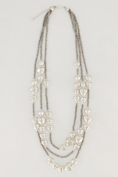 Kette, mehrreihig, mit Silberherzen und Glitzerperlen. Karabinerverschluss.