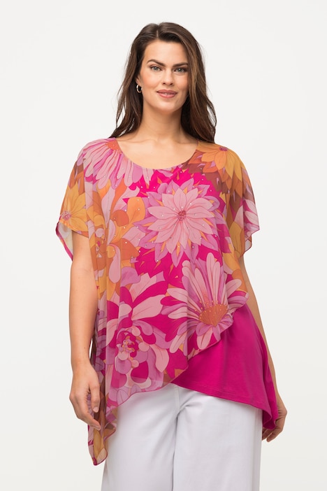 Bluse, doppellagig, mit Ziersteinchen auf dem geblümten Chiffon-Überwurf, Halbarm. Darunter blickdichtes Jersey-Top. Top und Überwurf mit Rundhalsausschnitt und asymmetrischem Zipfelsaum.