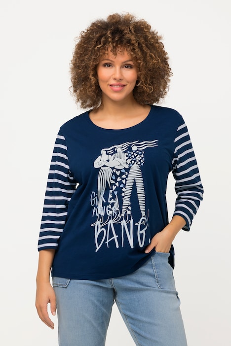 Shirt, Relaxed Fit, mit Ziersteinchen auf dem XL-Frauenmotiv und BANG!-Aufdruck. Rundhalsausschnitt, geringelte 3/4-Ärmel.