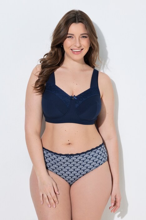 Entlastungs-BH, bügellos, aus hautsympathischer Baumwoll-Qualität mit feiner Spitze am Dekolletee. Angenehm breite, weich gepolsterte und verstellbare Träger. Stützendes Unterbrustband.
